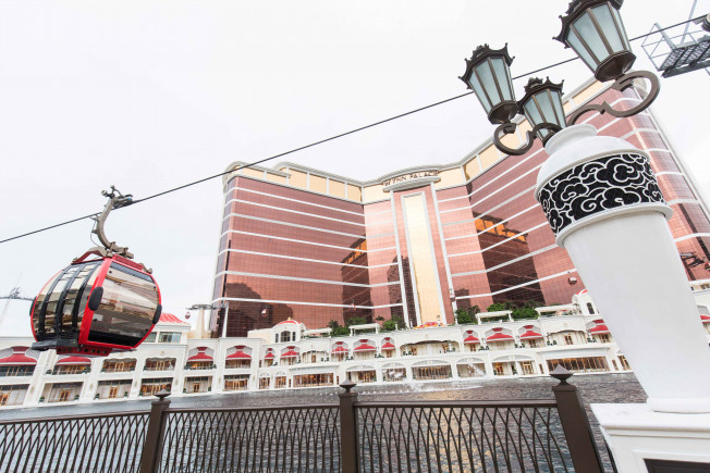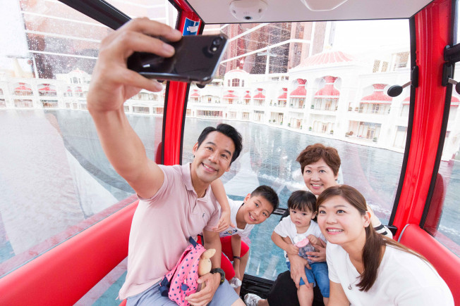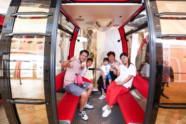 想不到在酒店也可乘坐纜車!登上永利皇宮的觀光纜車,徐榮一家都非常雀躍,置身28米高空,纜車圍繞酒店的表演湖運行,既可360°俯瞰表演湖的舞動噴泉表演,同時亦可飽覽澳門路氹迷人的日夜景致。車廂特設燈光和音響系統,會跟表演湖同步播放表演的樂曲,包包聽到音樂,馬上和哥哥手舞足蹈想跳舞。每個纜車車廂可載6人,一家大小乘搭剛剛好!