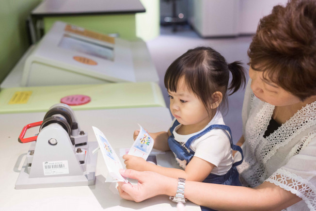 1樓主要展示郵政服務及歷史,並設有最受小朋友歡迎的「模擬飛行器」。朗朗一看到,也急不及待一嘗當機師的滋味。這裡還可以DIY郵票和名信片,連包包都要跟婆婆一起自製郵票帶回家。